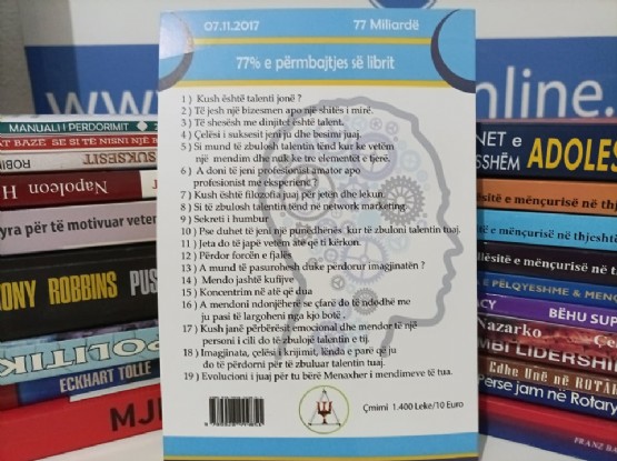 1. Cili është talenti jonë?2) Të jesh një biznesmen apo një shitës i mirë.3) Të shesësh me dinjitet është talent!4) Çelësi i suksesit jeni ju dhe besimi juaj.5) Si mund të zbulosh talentin tënd, kur ke vetëm një  mendim, dhe nuk ke tre elementët e tjerë.6) Dëshironi të jeni profesionist amator apo me eksperiencë?7) Si të ngeleni fëmijë në mënyrën se si i kërkoni dhe i merrni gjërat që doni.8) Cila është filozofia juaj për jetën?9) Cila është filozofia juaj për paranë?10) Disa pyetje që duhet t’i bëni vetes për të zbuluar talentin tuaj11) Sekreti i humbur12) Pse duhet të jeni një punëdhënës kur të zbuloni talentin tuaj13) Pyetjet që do t`ju ndihmojnë për të kuptuar nëse po ndërtoni një  biznes që ka të bëjë me talentin tuaj14) Ndërtoni suksesin tuaj duke ndihmuar të tjerët të arrijnë objektivat e tyre. 15) Jeta do të jap vetëm atë që ti kërkon!16) Kush janë përbërësit emocional dhe mendor të një personi i cili do të zbulojë talentin e tij.17) Imagjinata, çelësi i krijimit, lënda e parë që ju do të përdorni për të zbuluar talentin tuaj.18) Fjalët magjike që do t`ju ndryshojnë jetën pa kosto.19) Përdor forcën e fjalës20) Koncentrim në atë që dua 21) Mendo jashtë kufijve- Autori:  Muhamet Bizhga